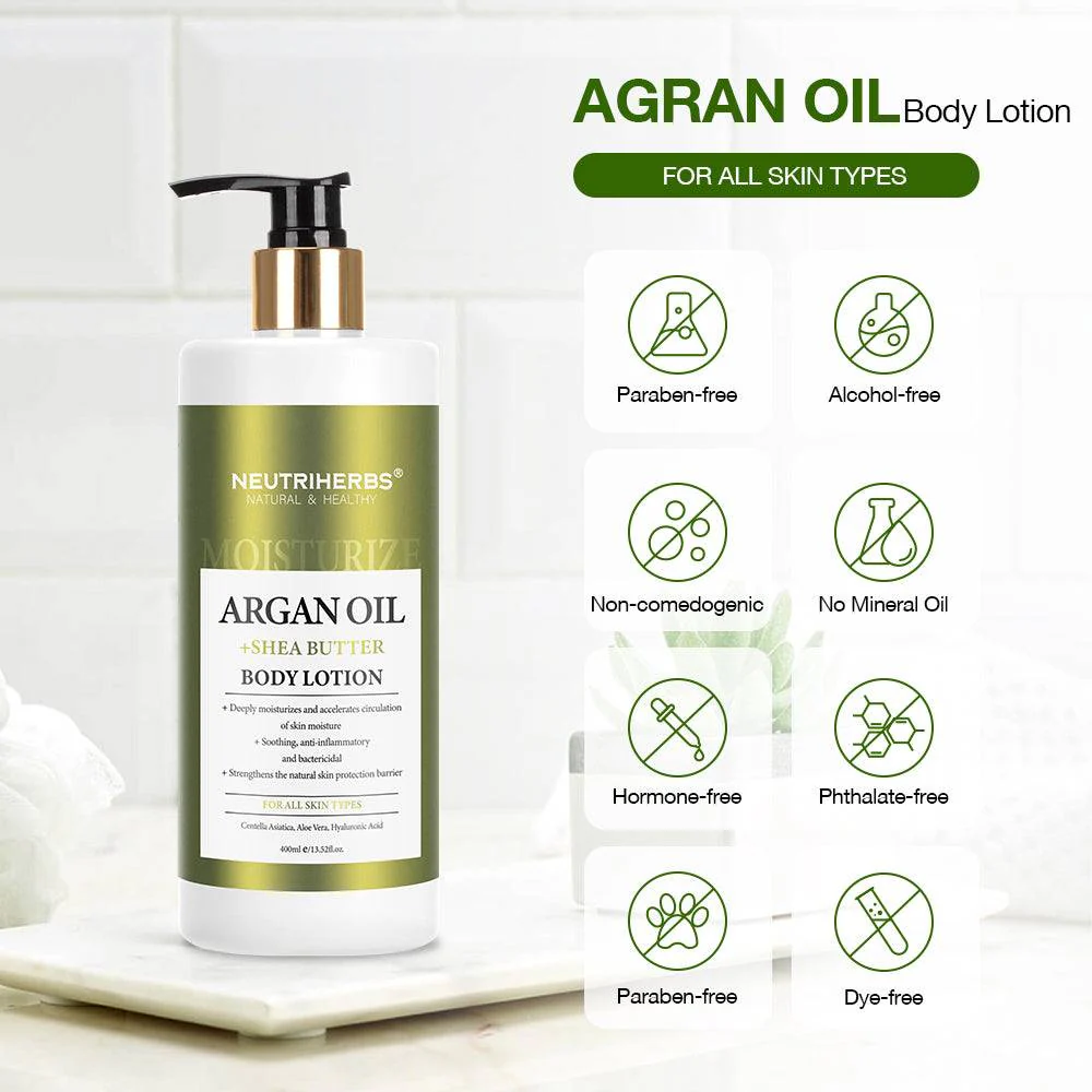 Neutriherbs Argan Oil body lotion is enriched with Argan Oil and Shea Butter. Originate from Morocco, restoring Argan Oil moisturizer is known as “liquid gold” for its healing and soothing properties. Shea Butter and Centella Asiatica can soften, regulate and moisturize skin while combating inflammation. This Lotion is light yet effective skin conditioning that provides intense hydration to help maintain visually softer, smoother and more supple skin while reducing the look of wrinkles, fine lines, and blemishes. It can be Absorbed easily without a greasy residue. Developed for all skin types.