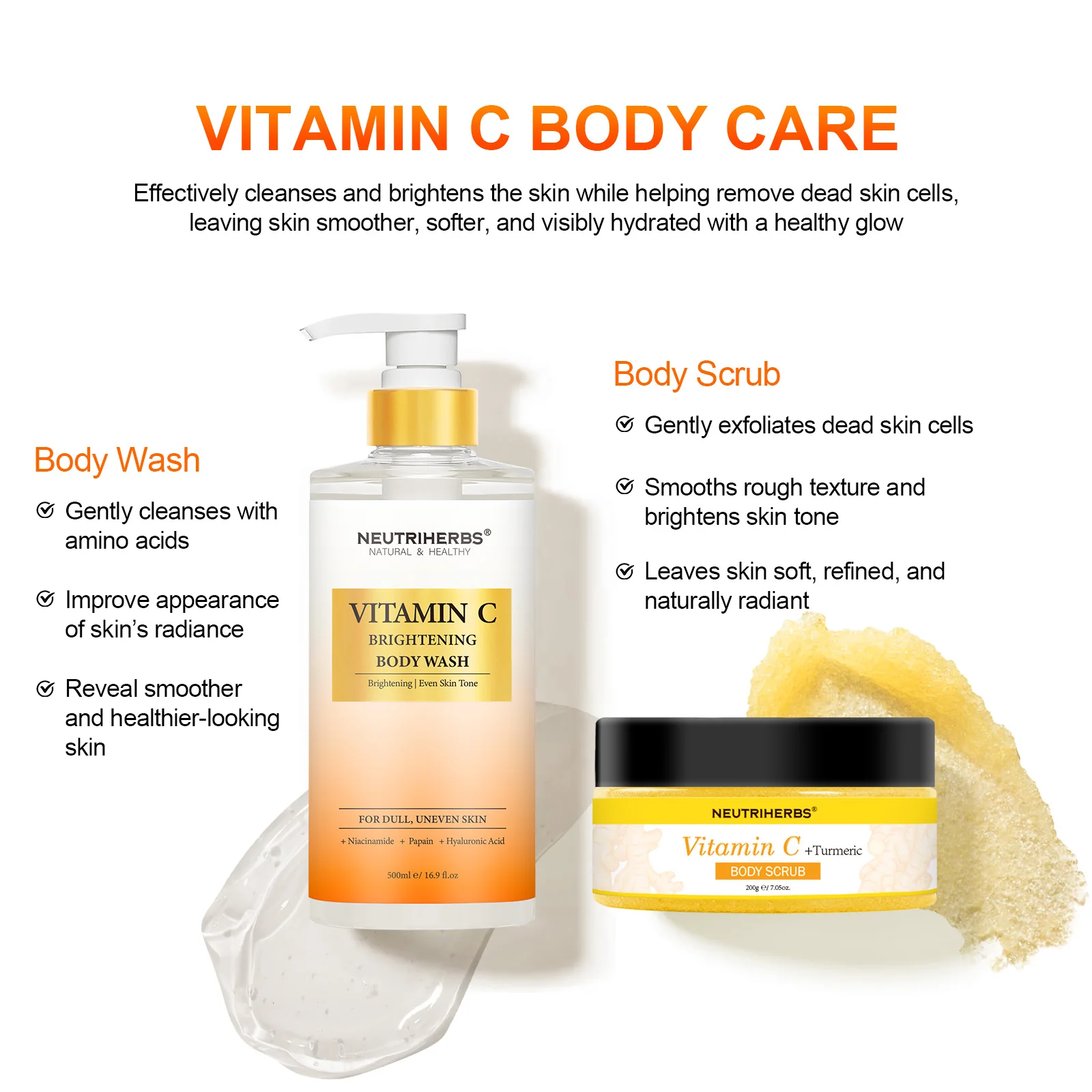 Neutriherbs Vitamin C Brightening Body wash with its rich lather, infuses your skin with skin care ingredients, leaving skin feeling soft and silky to the touch. And it easily rinses off clean without leaving an oily, coated feel.