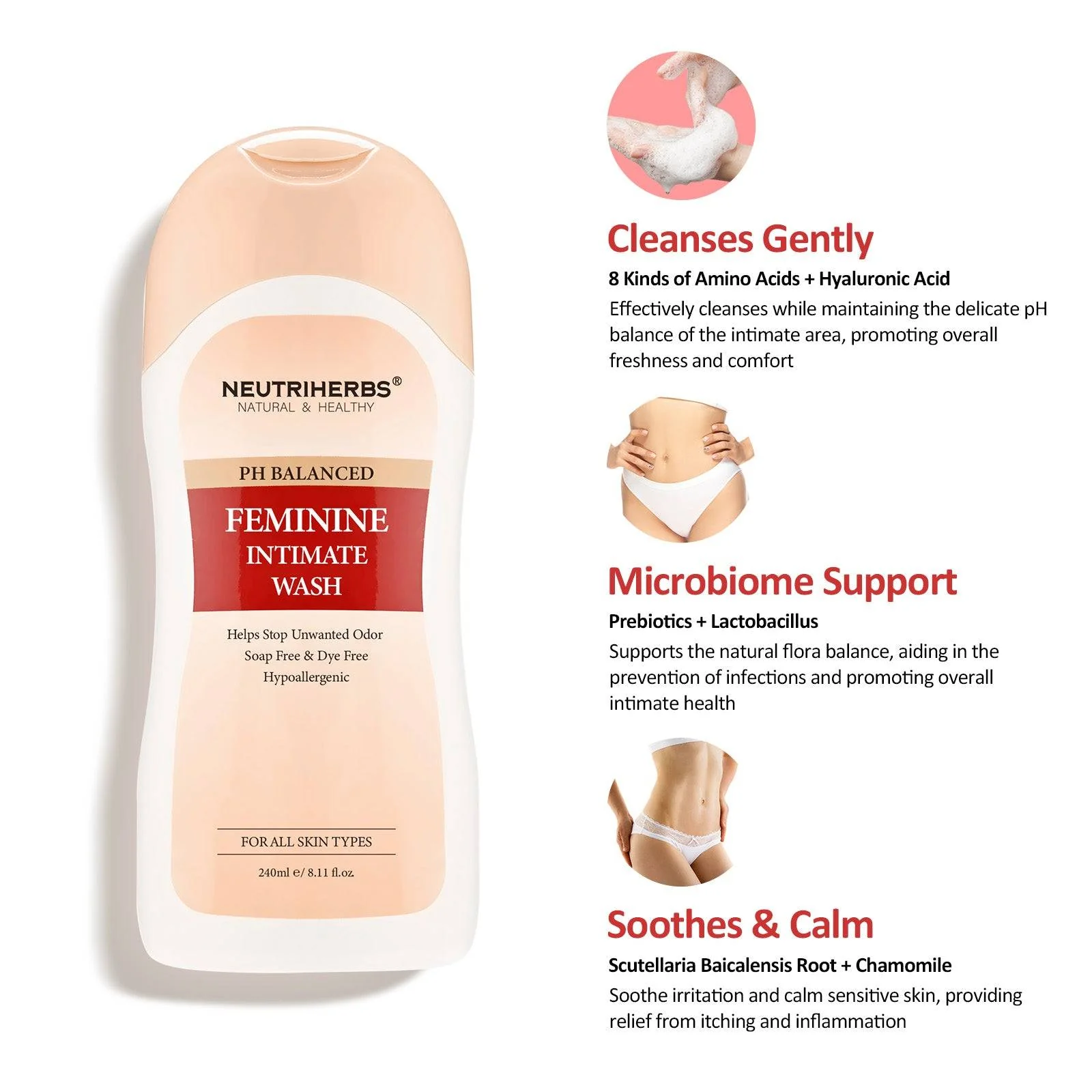Neutriherbs Feminine Intimate Wash gently cleanses the intimate area to help support healthy intimate skin without removing natural oils or moisture from the skin, and uses a velvety, delicate foam formula that is suitable for daily cleansing, as well as for sensitive skin. The gentle pH formula supports the micro-flora balance of the intimate area, and therefore helps to protect against harmful micro-organisms.