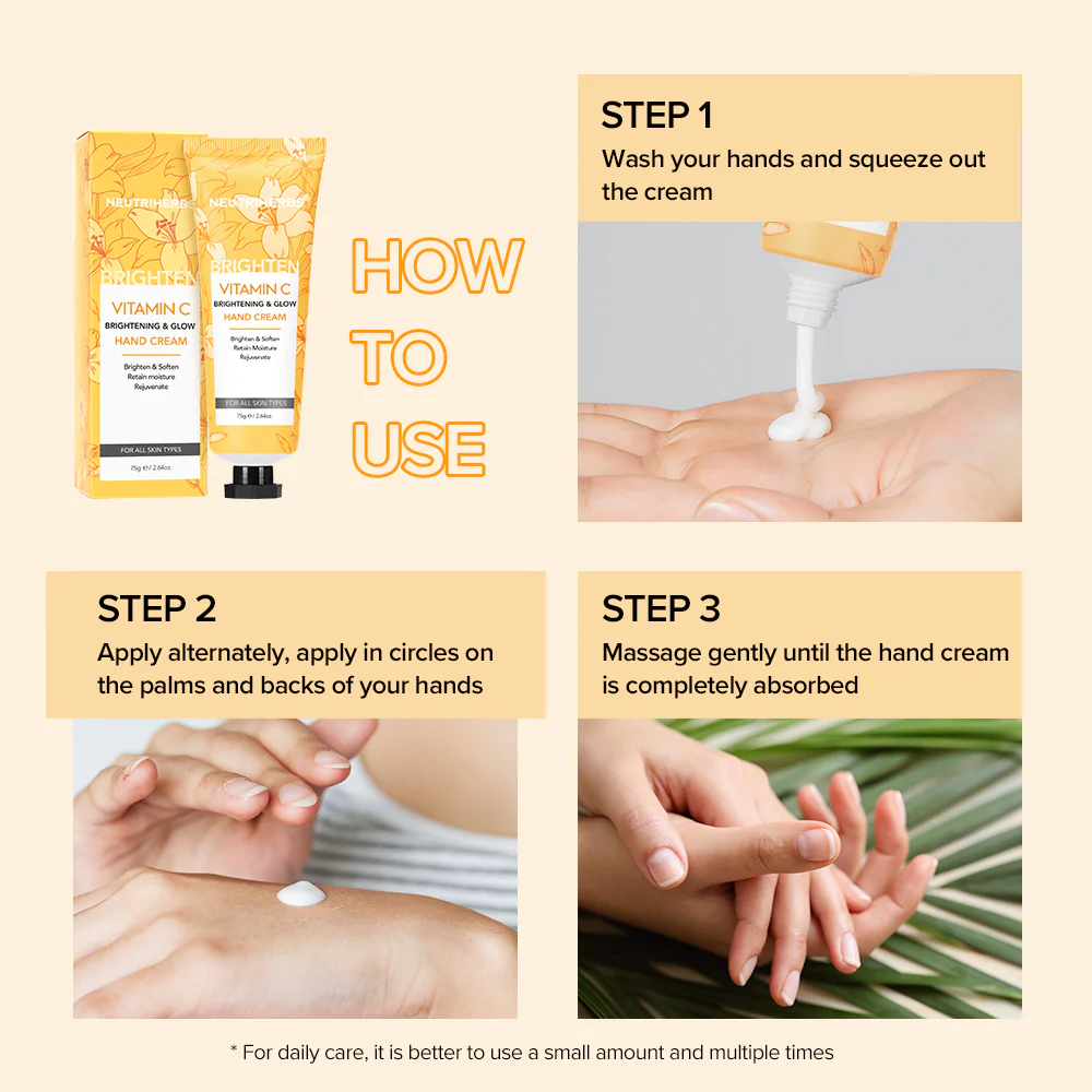 Neutriherbs Vitamin C Brightening & Glow Hand Cream immediately moisturizes and soothes the dry, cracked hands for leaving it feeling soft, smooth, and hydrated while help fade the appearance of sunspots and improve visible signs of aging. Rich hand cream strengthens skin’s moisture barrier against environmental stressors, even boosts skin’s ability to retain moisture, gives nails and cuticles some nutritious and nourishes skin with long hydration. This hand cream is non-greasy, non-sticky and fast-absorbing. It also smells beautifully zesty.